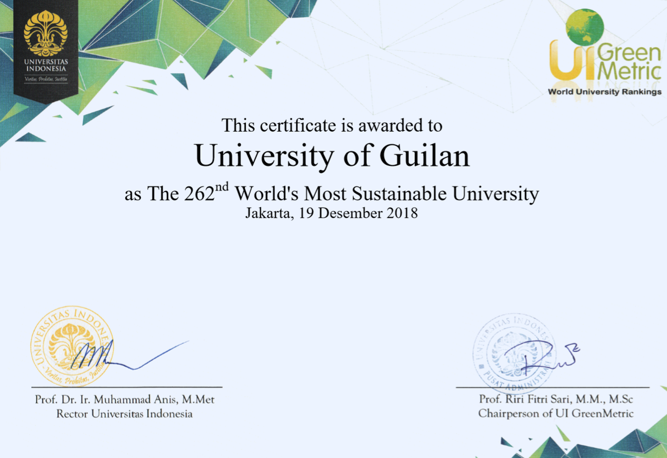 دانشگاه گیلان با بهره گیری از مدیریت و برنامه ریزی صحیح در خصوص حمایت از محیط زیست و الگوسازی برای کاهش مصرف انرژی و گاز های گلخانه ای به ترتیب موفق به کسب رتبه های 3، 4 و 5 در شاخص های مدیریت آب، زیرساخت و مدیریت پسماند از میان 16 دانشگاه ایرانی حاضر در این رتبه بندی شده است.